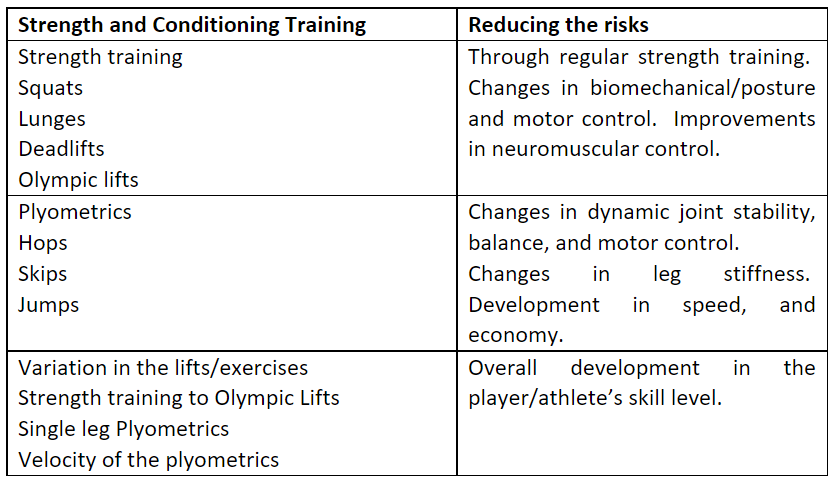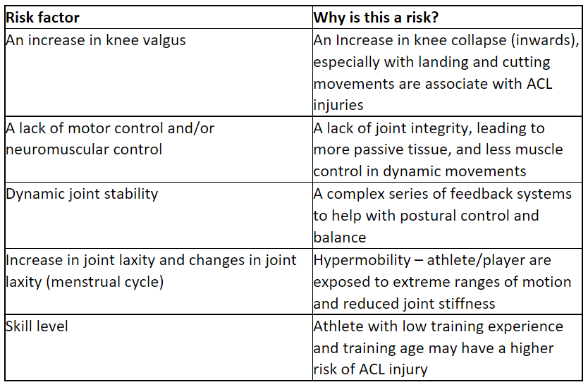 As with most musculoskeletal injuries, the literature will report that there’s no one causative factor, and we should view the injuries as multifactorial. However, as a strength coach, we still need to identify and list the different factors to see if we can develop qualities and/or strategies to help our players. The below table highlights the reported factors with ACL injuries.