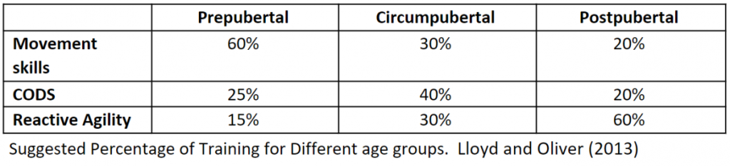 From a youth training and development model (long-term athletic development), Llyod and Oliver (2012), clearly state that agility should be trained throughout the different ages (pre-post peak height velocity), along with all the other physical capacities, strength, power, speed, and movement skills. Furthermore, Lloyd et al (2013), suggested that agility training for young children (pre-peak height velocity) should be skewed more towards COD and less reactive agility, as the young children can then concentrate on pre-planned drills, driving neuromuscular adaptations, via movement skills and practice. Reactive agility training should still be delivered to the young children, as races and tag-games are fun, but consider the training frequency and volume (Table 1 below).