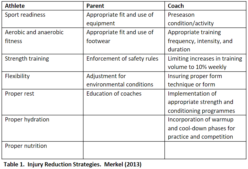 As growth and sport specialisation (playing only one sport throughout the year) are constant risk factors to developing an overuse injury, we need to consider that all parties; the athlete, coach and parents have a role in reducing youth-sport injuries. From the review by Merkel (2013), the researcher did a great job of identifying the different responsibilities for each party (table 1).
